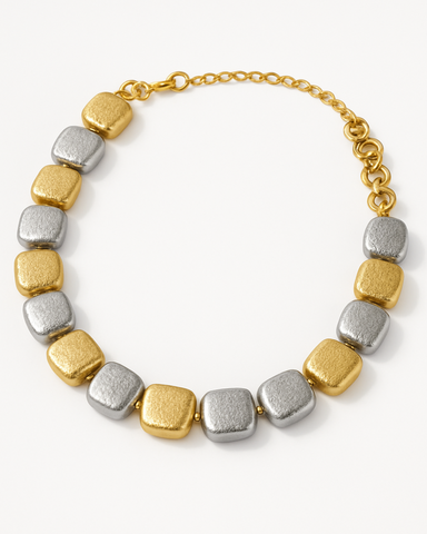 View full detailsMake a bold style statement with the ORANA Dual-Tone Luxe Hammered Square Bead Necklace, a perfect fusion of modern artistry and timeless luxury. F...