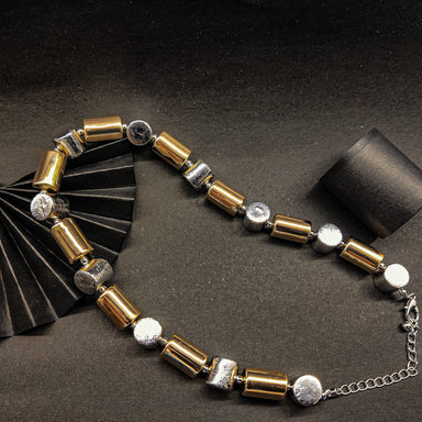 View full detailsStep into refined elegance with this statement-making dual-tone necklace, crafted with alternating cylindrical beads in polished gold and textured ...