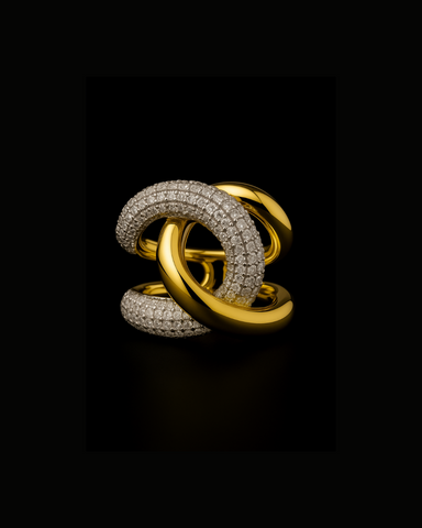 View full detailsThe ORANA Éternité Interlock Ring is a bold fusion of modern luxury and timeless artistry. Featuring intertwined loops of polished gold and pavé-se...
